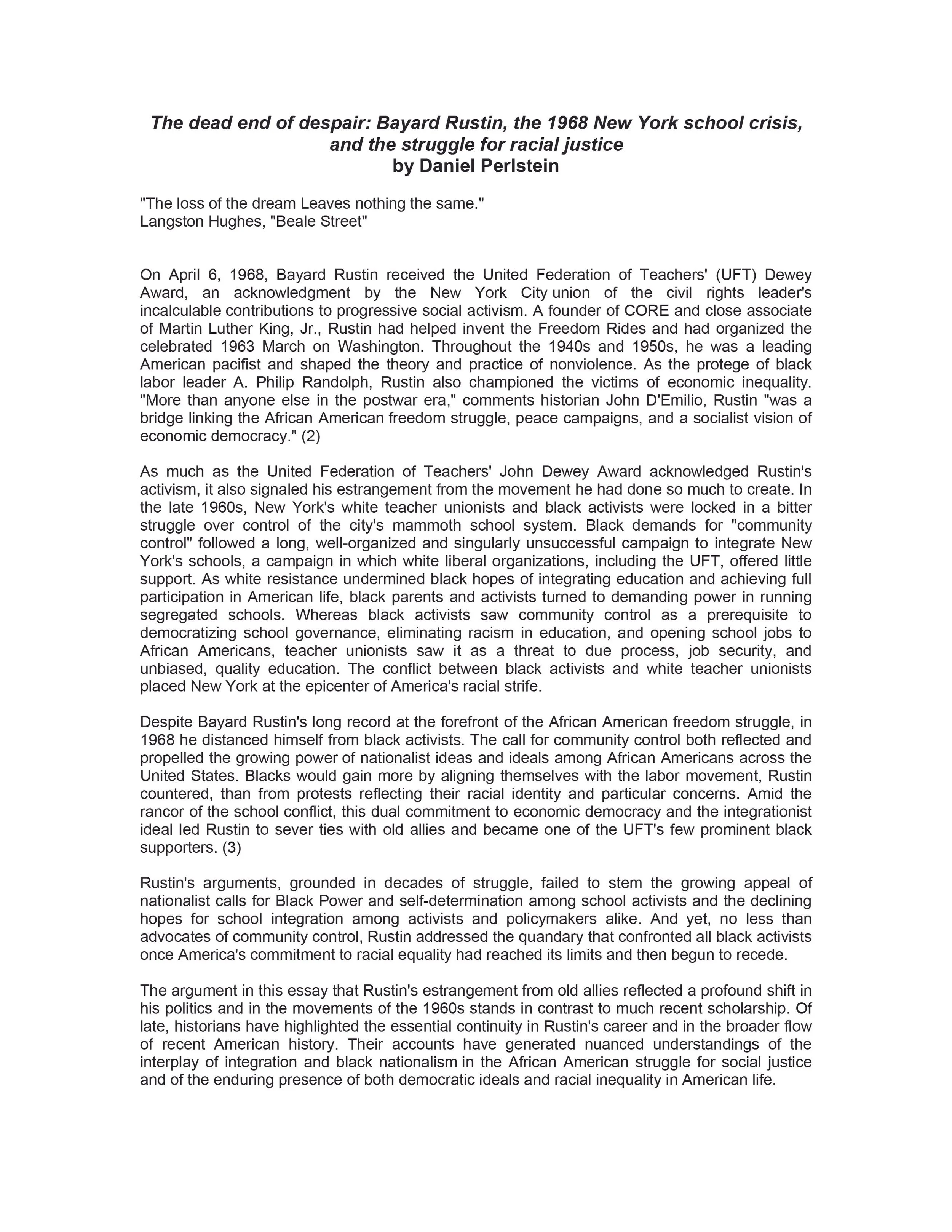 This week’s new additions explore two important moments in New York City’s education battles and Bayard Rustin’s evolving political strategy. Newspaper article, The Power of Absence examines the 1964 school boycott, where mass nonviolent action demonstrated the strength of coalition organizing, while the scholarly article The Dead End of Despair analyzes Rustin’s controversial stance during the 1968 school crisis and his defense of broad, interracial alliances. These entries reveal Rustin’s enduring belief that lasting change requires disciplined strategy and expansive democratic coalitions.