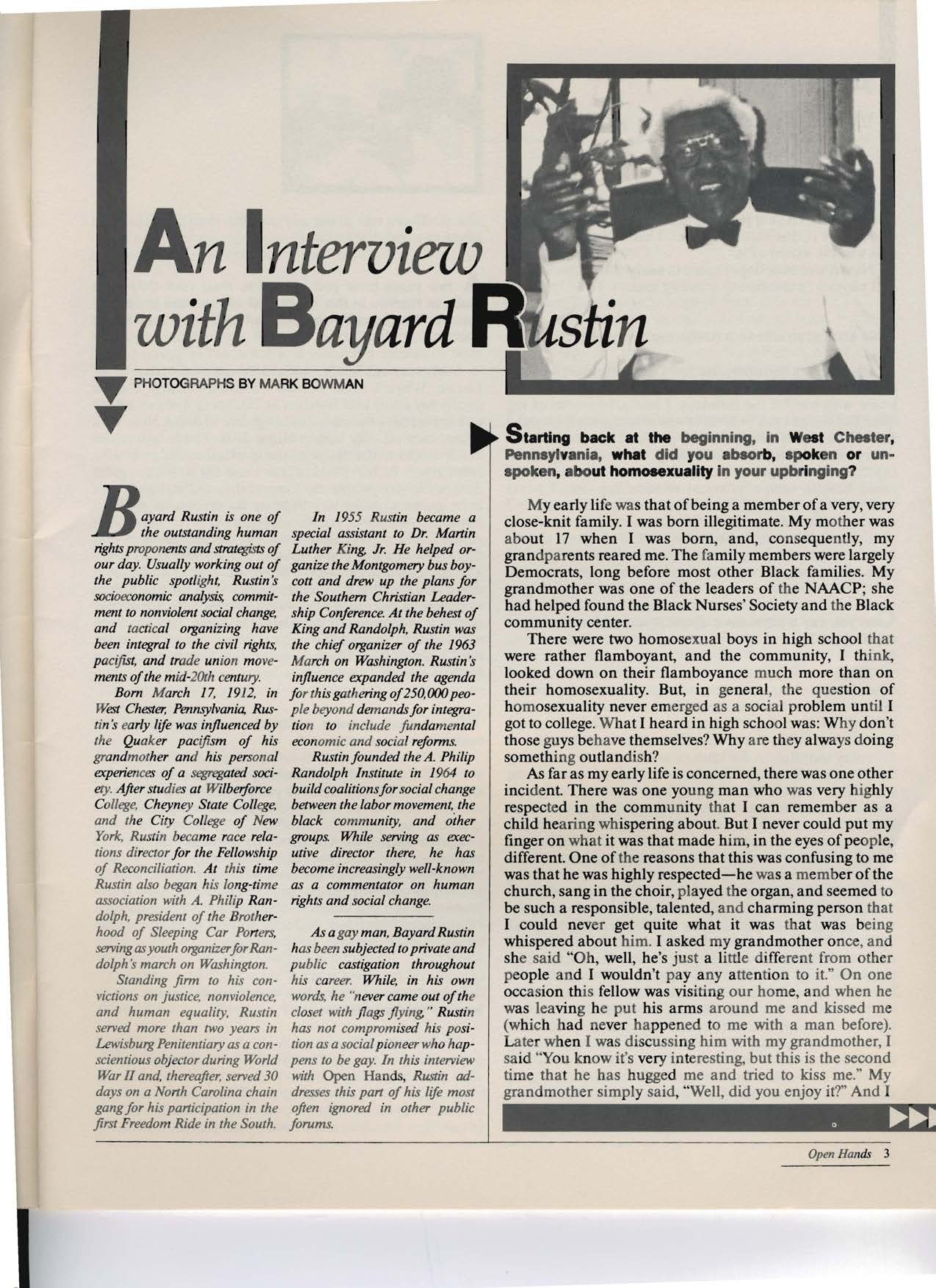 In a deeply personal interview with Open Hands, Bayard Rustin reflects on the intersections of his identity as a Black, gay, socialist, and conscientious objector, describing an upbringing in West Chester, Pennsylvania that quietly affirmed his dignity. He argues that LGBTQ+ people have become a modern “barometer” of social progress, insisting that a society incapable of accepting difference in private life cannot truly advance in human rights.