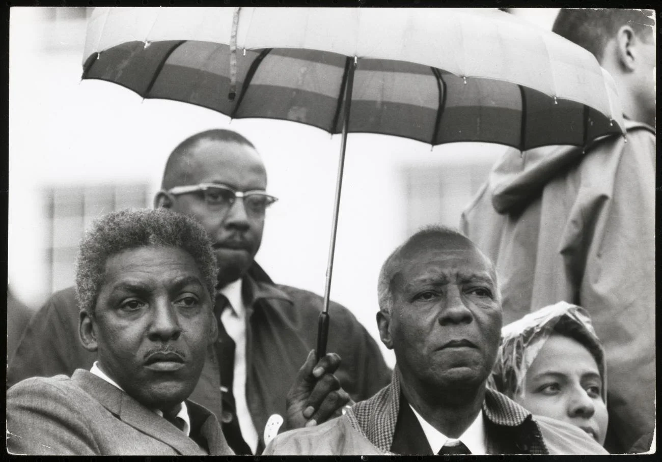 Bayard Rustin sits to the left alongside Malcolm X, who stands in the center, and debate moderator Michael R. Winston at Howard University. This photograph captures a moment during a pivotal 1961 event where these prominent figures engaged in dialogue connecting the struggles for civil rights and Black empowerment in America.