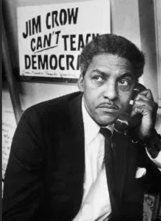 Rustin sits before a striking sign that reads "Jim Crow Can't Teach Democracy," encapsulating the spirit of his grassroots campaigns to expose and dismantle segregation in American society. The placard signals both protest and political messaging, emblematic of Rustin’s commitment to challenging the hypocrisy of racial discrimination in a nation founded on democratic principles.