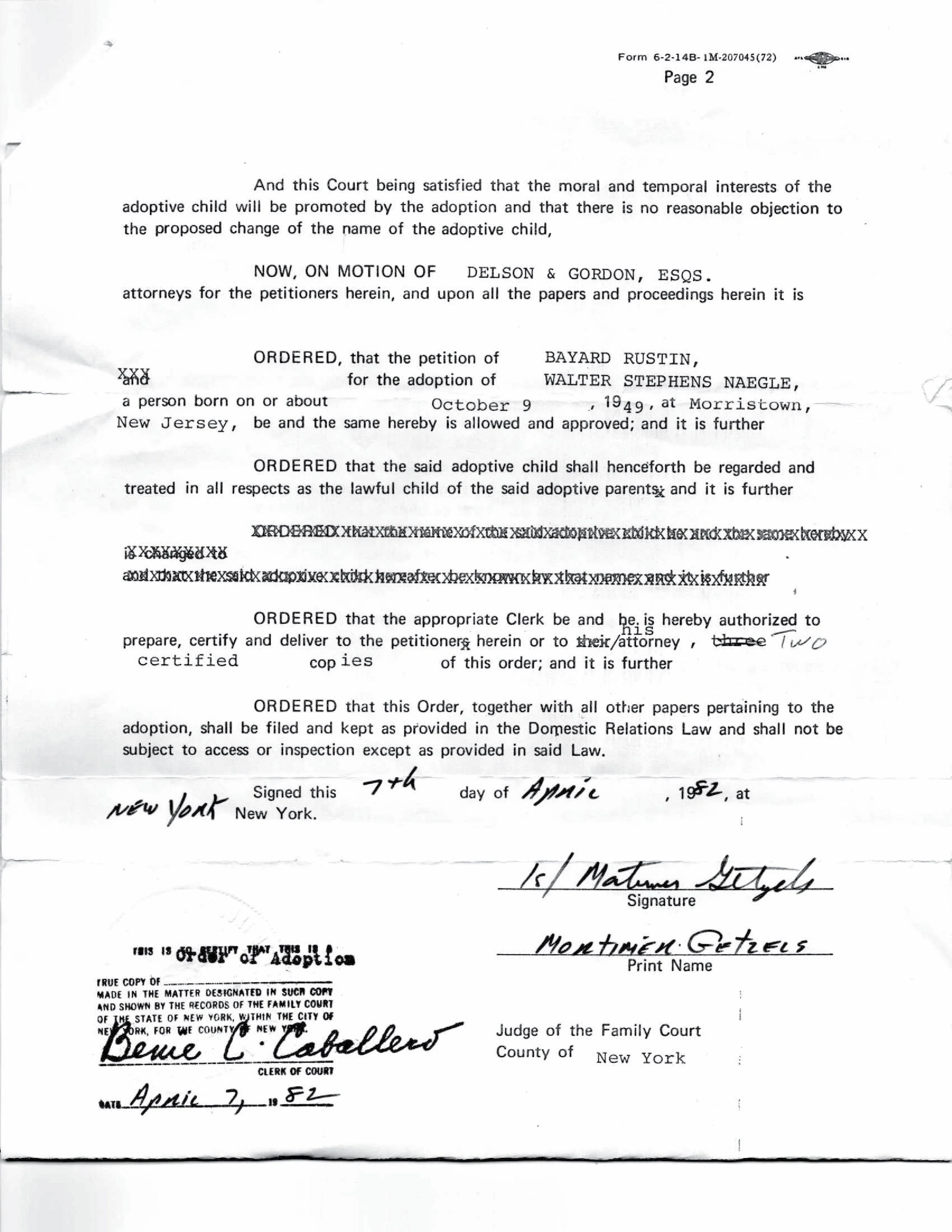 Family Court of the State of New York, County of New York. "Order of Adoption: In the Matter of the Adoption by Bayard Rustin of Walter Stephens Naegle." Signed April 7, 1982, by Judge Mortimer Getzels.