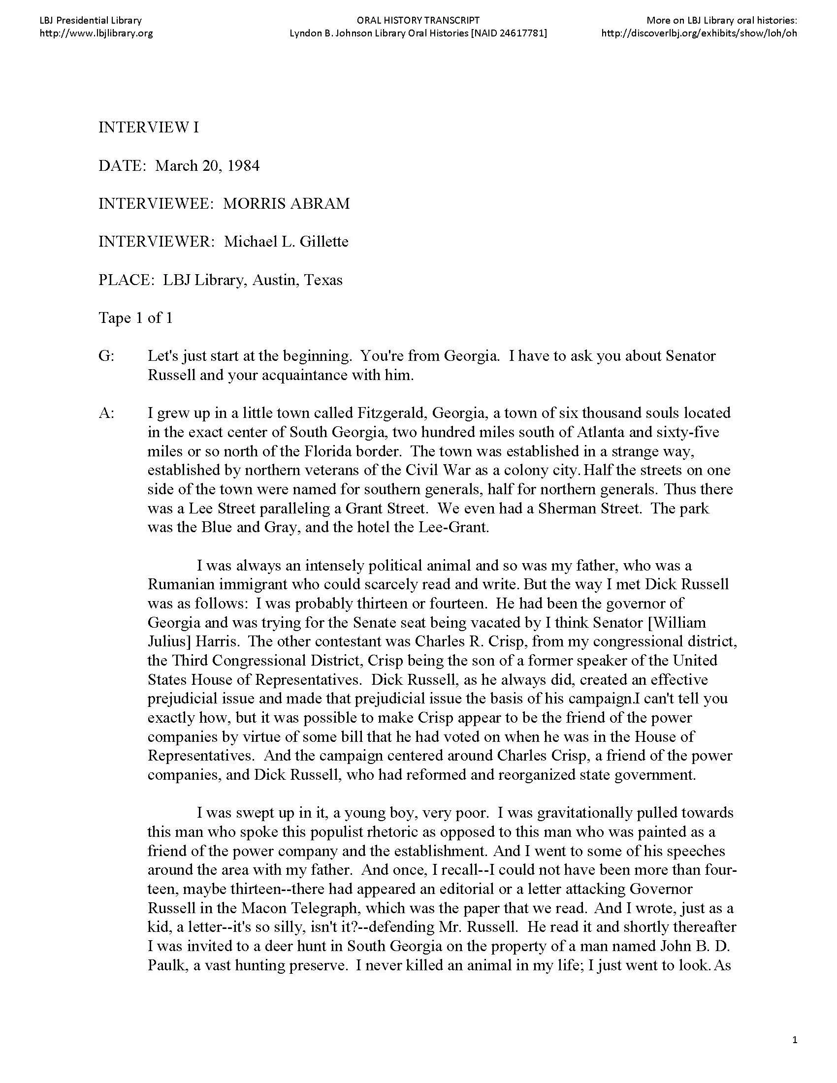 Abram, Morris. "Oral History Interview with Morris Abram." Interview by Michael L. Gillette. March 20, 1984. Lyndon B. Johnson Library Oral Histories.