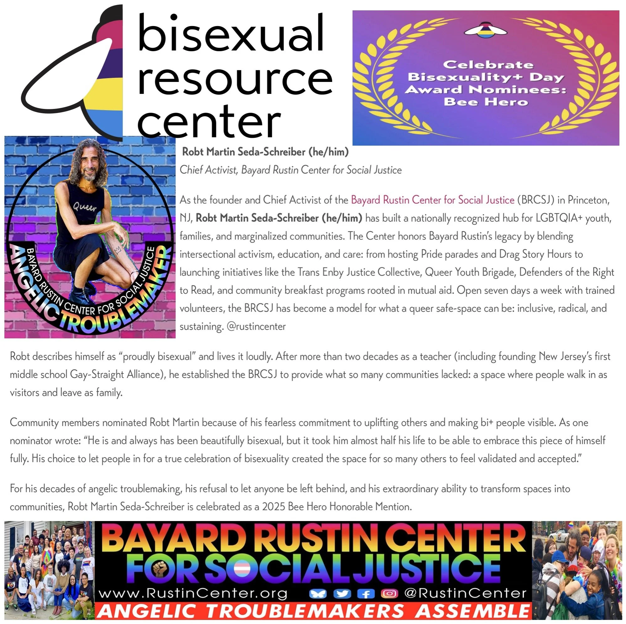 Robt Martin Seda-Schreiber (he/him/ always questionin’) is the proudly bisexual Chief Activist & National community Organizer of our Bayard Rustin Center for Social Justice. With a strong desire to ensure every individual- whether it be in a school, in a workplace, or in any & every community- feels safe, feels protected, & indeed feels loved, Robt established the Center with the explicit consent of Bayard Rustin’s partner, the wonderful Walter Naegle.